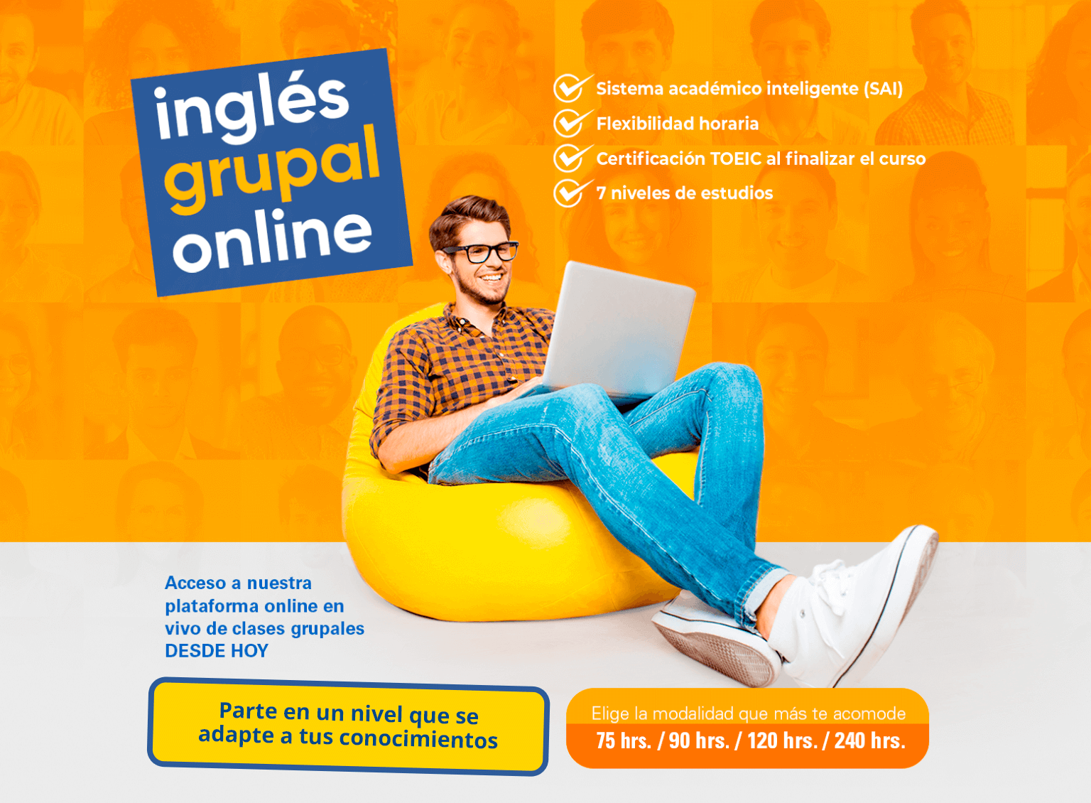 En la modalidad grupal podrás estar en clases junto a un grupo de personas, dicho grupo está conformado por pocos estudiantes, lo cual hace mucho más fácil el aprendizaje.